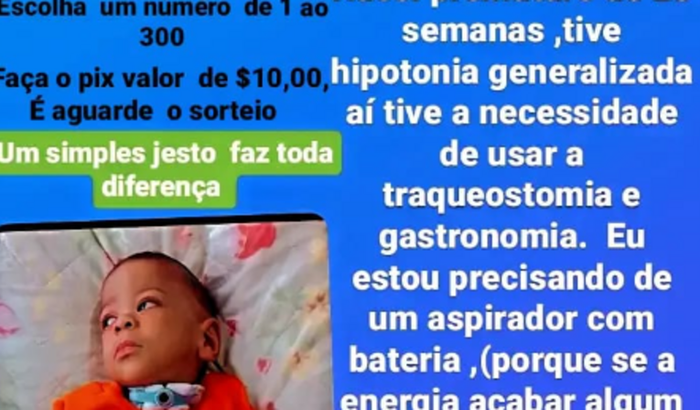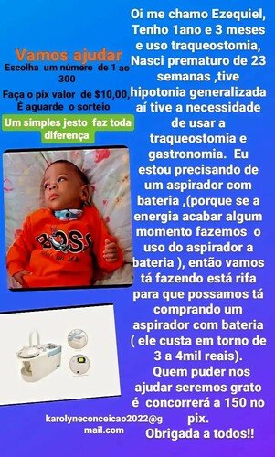 hipotonia generalizada aí tive a necessidade de usar a traqueostomia e gastronomia. Eu estou precisando de um aspirador com bateria, (porque se a energia acabar algum momento fazemos o uso do aspirador a bateria), então vamos tá fazendo está rifa para que possamos tá comprando um aspirador com bateria ( ele custa em torno de 3 a 4mil reais).