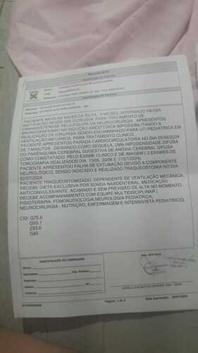 Paciente apresentou parada cardiorrespiratória no dia 05/06/2024 de 7 minutos deixando como sequela, uma hipodensidade difusa do parênquima cerebral sugestiva de anóxia cerebral difusa como constatado pelo exame clínico e de imagem (3 exames de tomografia realizados dia 13/06, 20/06 e 17/07/2024).