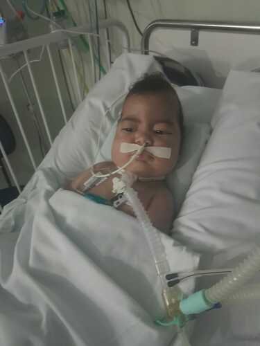 Paciente traqueostomizado, dependente de ventilação mecânica, recebe dieta exclusiva por sonda nasoenteral, medicação anticonvulsivante, acamado e sem previsão de alta no momento. Recebe acompanhamento com equipe multidisciplinar (fisioterapia, fonoaudiologia, neurologia pediátrica, neurocirurgia, nutrição, enfermagem e intensivista pediátrico).