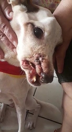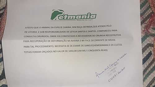 Oi meus AUmigos, tudo bem? Me chamo Vitoria vou contar a vcs um pouco da minha história... faz um tempinho que fui encontrada no Cabula, na região do Bompreço. Encontrada não, RESGATADA! Eu estava jogada entre o passeio e o asfalto, muito debilitada, cansada e precisando de muitos cuidados. Ai, um anjo passou por lá e graças a Deus, me notou e me resgatou... Esse anjo se tornou meu anjo da guarda! Meu anjo é a Tia Leticia! Ela passava de moto quando parou na sinaleira e me viu bem malzona. Eu estava tremendo e sangrando muito. Ela não hesitou em momento algum e pediu ajuda a todos e conseguiu me levar para um atendimento médico veterinário. Chegando lá na emergência, falaram para minha Tia Leticia que eu estava com miíase (aquele bichinho nojento que vcs chamam de morotó) na boca e bochecha. Precisei fazer um raio x, pois eu estava com um buraco entre o nariz, bochecha e boca. Fiz também exames de sangue. Devido a extensão dos traumas que eu sofri no meu rostinho, os pontos não seguraram e hoje tenho bastante dificuldade para me alimentar, respirar e dormir. Tia Leticia já me deu remédio para as vermes e minhas vacinas também já estão em dias. Ela também já conseguiu com outros anjos, meus aumigões, a contribuição financeira de 700,00 para meu novo procedimento de reconstrução da Narina. Agora só faltam 1.300,00 (Cirugia+ pos cirúrgico + acupuntura). Por isso, vim aqui pedir a ajuda de vocês para ter uma melhor qualidade de vida. AUmigos, eu sou uma guerreira, pq eu venci tbm uma cinomose. Posso contar com sua ajuda??