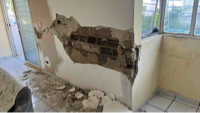 A situação é crítica. Há rachaduras visíveis tanto na parte externa quanto interna do prédio, e um dos pilares está apresentando sinais de colapso. Por conta disso, já foram colocadas escoras provisórias nas varandas, como na do nosso apartamento 102 e no do vizinho de cima, o 202, pois o maior risco é que as varandas desabem, levando consigo as pilastras que sustentam a estrutura.