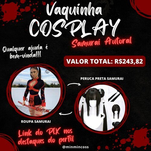 Oiiie! Eu sou a Minmin Coss (@minmincoss) e estou fazendo essa vaquinha para conseguir fazer o cosplay de uma personagem aue estou criando, ela é uma Samurai, já tenho alguns acessórios, mas estou fazendo a vaquinha para conseguir a roupa e peruca. Qualquer ajuda é mt bem vinda!