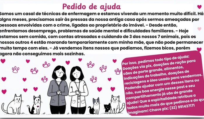Desde então, enfrentamos desemprego, problemas de saúde mental, dificuldades familiares e muita instabilidade. Hoje estamos com contas atrasadas, sem comida e cuidando de 3 dos nossos animais — os outros 4 estão temporariamente com minha mãe, que está doente e não poderá cuidar deles por muito tempo.