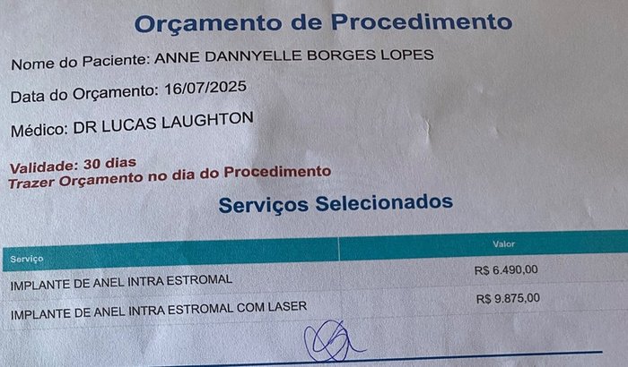 No meu caso será a implantação de um anel instraestromal no valor de 9.875,00 que é feito de forma particular, visto que o meu caso se encontra em estágio avançado necessitando de ser realizada com urgência não tendo a possibilidade de aguardar a tentativa do custeio pelo SUS.