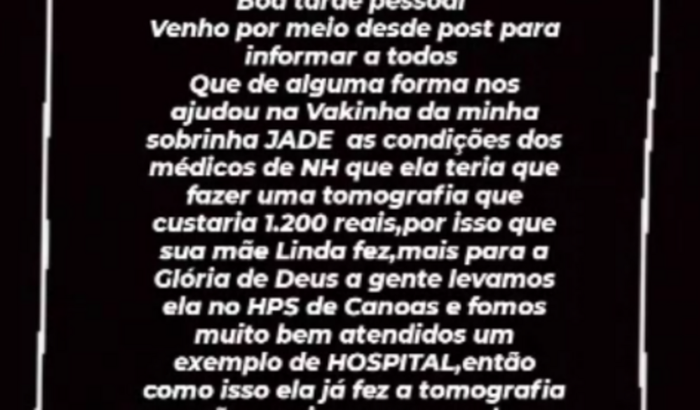 Eu sou Linda ines da Silva e fiz essa vaquinha, pois minha nene de 8 meses precisa fazer uma tomografia e precisamos de 1,200 (mil e duzentos) para pagar anestesia para ela sozinha não consigo e preciso de ajuda ver tudo