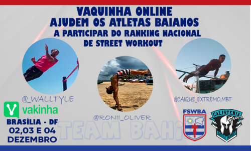 Sou Ramilson Oliveira Presidente da Federação de Street Workout da Bahia, estamos fazendo esta vaquinha para ajudar três atletas baianos a participarem do ranking nacional de Street Workout.