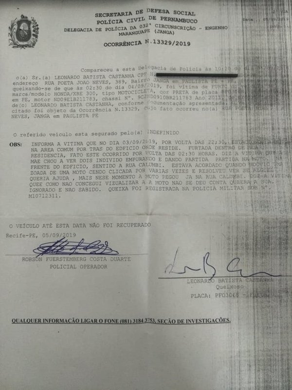Na noite da terça-feira (dia 03/09) cheguei em casa depois de mais um dia de aulas no grande Recife e, como de costume, guardei a moto por trás da área comum do edifício em que moro no bairro do Janga, Paulista. Às 2:30h da madrugada da quarta-feira (dia 04/09), ouvi um barulho de motor de partida de moto seguidas vezes. Como moro numa rua bem movimentada (Rua Poeta João neves), achei se tratar de algum motociclista com problemas e estava disposto a descer para ajudá-lo. Realmente cheguei até a área de serviço (moro no primeiro andar), olhei pra rua transversal (Rua Calumbi) de onde vinha o barulho, mas não pude visualizar a moto que logo deu partida e seguiu em velocidade. Pensei: "ele conseguiu colocar pra pegar, que siga em paz". Mas era a minha própria moto [Honda XRE 300 preta - 2011 - placa PFO 3068] que estava sendo furtada... só fui me dar conta na tarde do dia 04 (quarta) às 15h quando fui sair para mais uma dia de trabalho. Atônito e abalado, fiz o BO pelo telefone da PM e seguimos para a delegacia do Janga a qual se encontrava fechada por conta de um feriado da cidade, nos encaminhamos para a delegacia do centro de Paulista, a qual deveria estar em plantão mas, para o nosso espanto e tristeza, também estava fechada. Já à noite, indo de delegacia em delegacia, fomos bater na cidade vizinha (Olinda), mas o sistema estava fora do ar e não conseguimos finalizar o BO. Só conseguimos fazer o BO na manhã do dia 05 (quinta-feira) na delegacia do Janga, isto depois de esperar por duas horas até o sistema de roubos e furtos voltar a funcionar. Nos dias que se sucederam (05/09 e 06/09) ocorreram mais dois furtos de moto... todas Honda XRE 300 pretas aqui no bairro. Enfim... no dia de hoje, não alimentando mais muitas esperanças em ter de volta a minha Bicuda, entrego o caso primeiramente a Deus e depois às autoridades competentes. Pretendo, com muito trabalho e a ajuda dos amigos, substituí-la em curto prazo. "The Show Must Go On"...