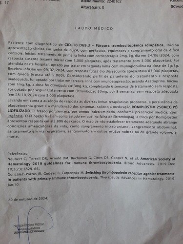Cid -10D69.3 Púrpura trombocitopenica idiomática que se trata de uma doença auto imune que se caracteriza pela destruição das plaquetas ,células produzidas na medula óssea e ligadas ao processo de coagulação inicial do sangue .