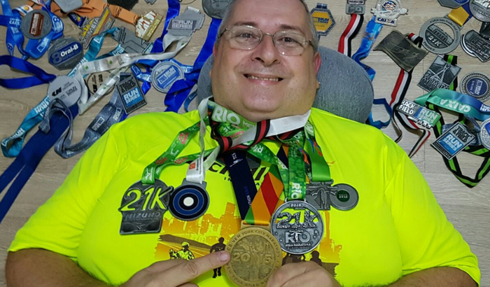 Comecei a participar de provas de rua através do convite da ONG Achilles International Brazil em Sampa, Rio, cidades interior de São Paulo, acredito que já devo ter rodado uns 6000 km acumulando uma centena de medalhas participativas. Mais minha Medalha Especial veio através da minha primeira Maratona em Nova York realizada em 2015.