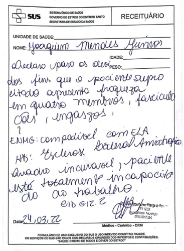 Ele morava no Espírito Santo com sua esposa, a Tia Gi, e desde o diagnóstico, tem recebido toda assistência possível pelo SUS, fazendo o tratamento paliativo com uso de medicações contínuas, vitaminas e fisioterapia. A Tia Gi se dedica integralmente aos cuidados e acompanhamentos do Tio Junior e ambos vivem de doações e com apoio de nós, familiares e amigos.
