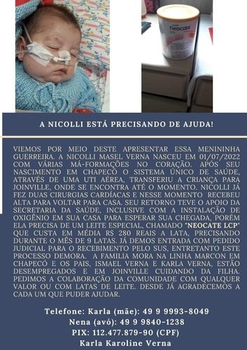 venho pedi ajuda para pequena Nicolle ela precisa tomar um leite especial esse leite mas é muito caro 250 cada lata