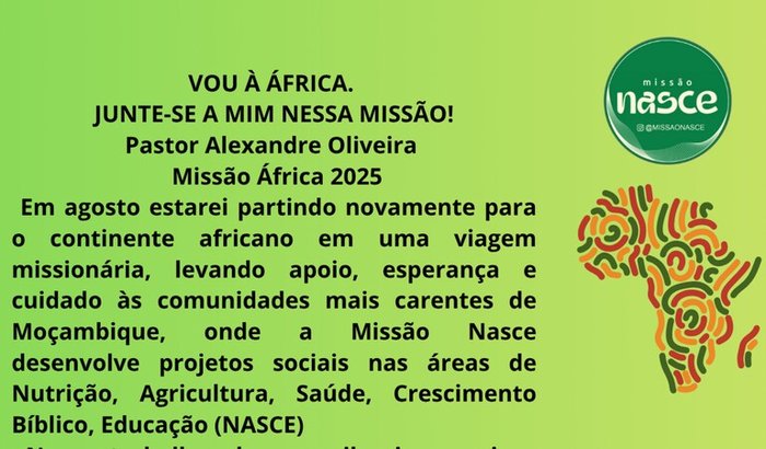Eu sou o Pastor e Professor Alexandre Tadeu Cardoso de Oliveira, desde 1995 estou engajado em projetos e ações humanitárias ajudando o povo africano, com a organização Missão Nasce, sempre estou indo a Moçambique levar apoio, visitar e acompanhar os projetos sociais que levam dignidade, sustento, educação a crianças, adolescentes, jovens, adultos, idosos, a população em geral. Servir a este povo que Deus tanto ama é um privilégio, e todos os recursos são aplicados nesta jornada, onde tudo é feito com amor, transparência e responsabilidade. Este ano, em agosto, estarei indo servir junto a essa comunidade, e preciso levantar urgente os recursos para a viagem, despesas, e apoio aos projetos que são desenvolvidos, inclusive fazer levantamento para a implantação de um projeto socioambiental onde através da reciclagem do lixo, iremos produzir material para construção de moradias, banheiros, móveis, brinquedos, etc. Projeto Transformando Vidas ("Shandura" no dialeto local). Junto em minha Equipe está o Pastor Orlando Rodrigues, nosso diretor Executivo, que vai pisar pela primeira vez em Moçambique conosco, e atender juntamente as atividades e coordenações dos projetos. Peço a sua ajuda, pois os valores das passagens e variação do câmbio das moedas tem subido muito, precisamos do seu apoio urgente!