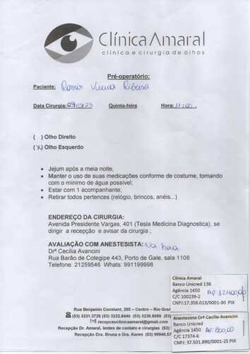 Precisei realizar uma cirurgia emergencial de vitrectomia, pois 50% da retina do meu olho esquerdo descolou após eu sofrer uma queda enquanto trabalhava. A cirurgia foi um sucesso graças a Deus e já me encontro em casa repousando.