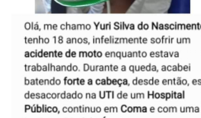 Olá me chamo Yuri da Silva do Nascimento tenho 18 e infelizmente sofri um acidente de moto enquanto trabalhava. Durante aa queda bati forte a cabeça, desde então estou desacordado na UTI de um hospital público, com lesão na medula óssea. Minha família gostaria de me transferir para um hospital particular,para a melhoria da minha condição, porém nao temos condições, por isso gostaria de pedir ajuda de vocês, pois a mínima ajuda será de grande valor pra mim, serei grato em qualquer valor que toque em seu coração e que Deus abençoe a cada um!