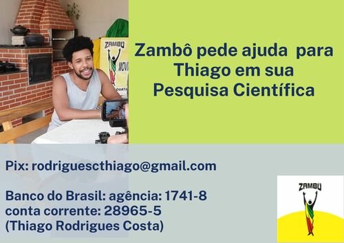 Prezados, a Associação Zambô do Movimento Negro de Caraguatatuba, vem pedir sua ajuda para Thiago Rodrigues Costa, que cursa Ciências Sociais na UNESP de Araraquara. Ele é um jovem negro, aluno aplicado e morador da periferia de Caraguatatuba no bairro Perequê-Mirim. É fruto de projeto social da Zambô, com seu esforço e mérito, está desenvolvendo um projeto de pesquisa cientifica na área de Antropologia das Populações Afro-brasileiras. Para levar adiante a pesquisa ele precisará de auxílio para os gastos com transporte, estadia, alimentação, e materiais para pesquisa. O valor total das despesas:R$ 3.000,00, contamos com sua ajuda.