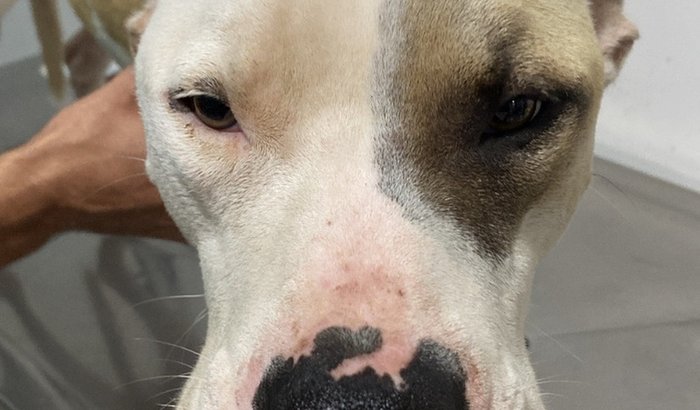 "TÁ VENDO ESSE PITBULL AÍ DA FOTO? É o cachorro mais amável que eu conheci na minha vida inteira, e mesmo assim foi covardemente abandonado no meio de um matagal!!! De tanto tentar se soltar da corrente, ele acabou criando uma grande ferida no pescoço
